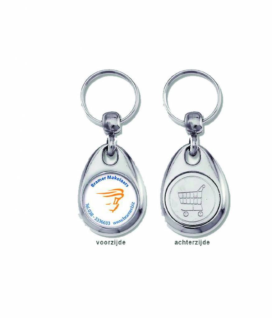 Onze sleutelhangers worden in full colour bedrukt op ééñ zijde. Het bedrukbare oppervlak is 25 mm rond. Aan de andere zijde zit het metalen winkelwagenmuntje welke standaard is gegraveerd met de afbeelding van een winkelwagen. Bij grotere afnames is het mogelijk een eigen gravure in het metalen muntje te plaatsen.